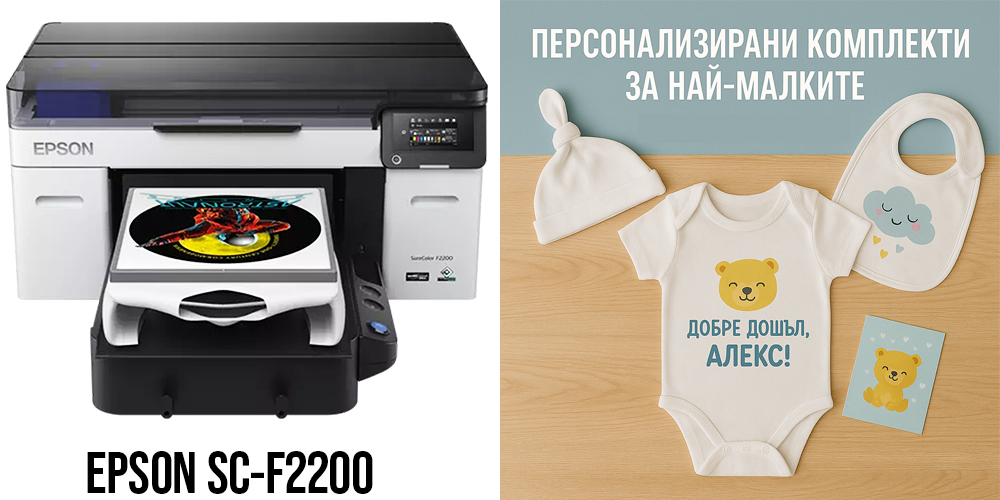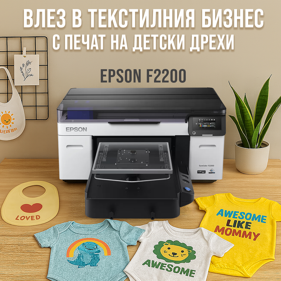 Стартирай собствен бранд с печат на детски дрешки – умно и сигурно – с технология, която ти дава контрол, качество и нисък риск - EPSON SC-F2200 DTG/DTF принтер