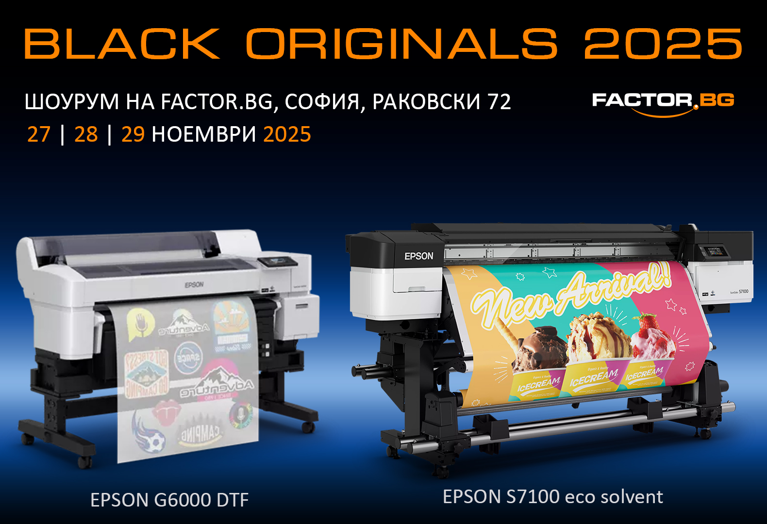 - Epson G6000 – първият професионален DTF принтер от EPSON за печат върху бял, цветен и черен памучен и полиестерен текстил, деним и други материи. Той работи с оригинални, специално създадени за това приложение мастила, предлага се пълна 1-годишна гаранция (с опция за удлъжаване), и като цяло е решение, на което може да се разчита. С принтера ще бъде представен и Miro 36 DTF шейкър и сушилня - цялостно оборудване за завършен на процес по декорация на текстил.